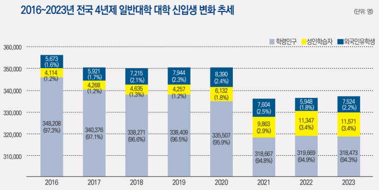 °í3, N¼ö»ýÀ¸·Î ´ëÇ¥µÇ´Â ÀüÅë ÇзÉÀα¸°¡ ÁÙ¾îµé¸é¼, ±× ºóÀÚ¸®¸¦ ¼ºÀÎÇнÀÀÚ¿Í ¿Ü±¹ÀÎ À¯ÇлýÀÌ Á¡Â÷ ä¿ö³ª°¡°í ÀÖ´Ù. ´ëÇÐÀº ¡®Æò»ý±³À° Ç÷§Æû¡¯À¸·Î ÇâÇϰí ÀÖ´Ù. |